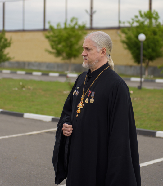 Сопровождающий начальника УМВД в данной рабочей поездке член Общественного совета при региональном Управлении настоятель храма Святого великомученика Пантелеймона, отец Владимир совершил молебен о воинах, несущих службу по охране общественного порядка в Ингушетии, принес в дар личному составу авторские книги Митрополита Митрофана в библиотеку отряда.