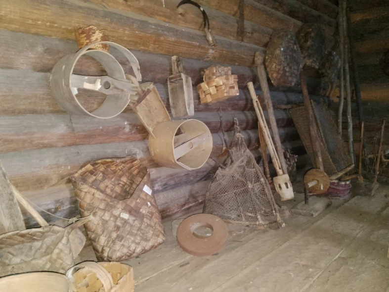 Чтобы наглядно рассказать о проблеме, девушка приглашает пройти в избу через хозяйственную постройку – в отличие от жилой части, недавно отремонтированную. С первым шагом невольно погружаешься в прошлое. Под крышей сеней собраны разные бытовые вещи: люлька, самовары, хомуты для лошадей… В прошлом тысячелетии они широко использовались крестьянами.