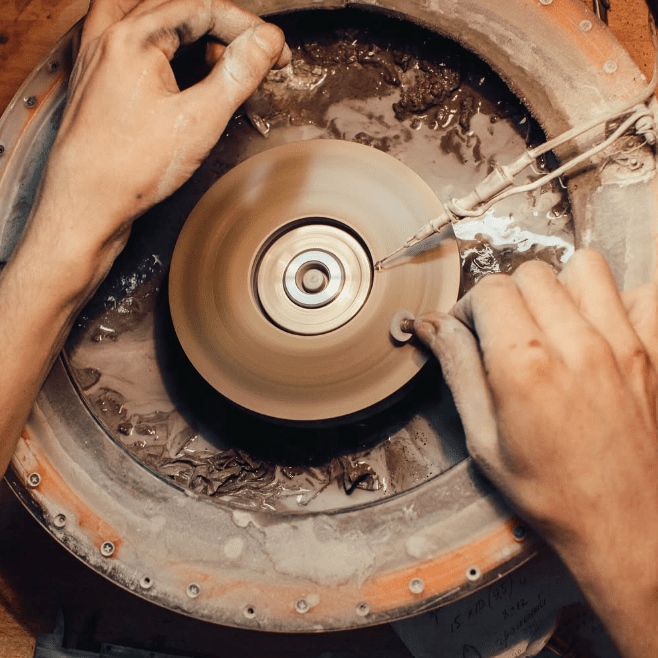 Изделия делают вручную — на фото мастер катает кабошон горного хрусталя для коллекции Origin 0;0. Источник: соцсети Avgvst