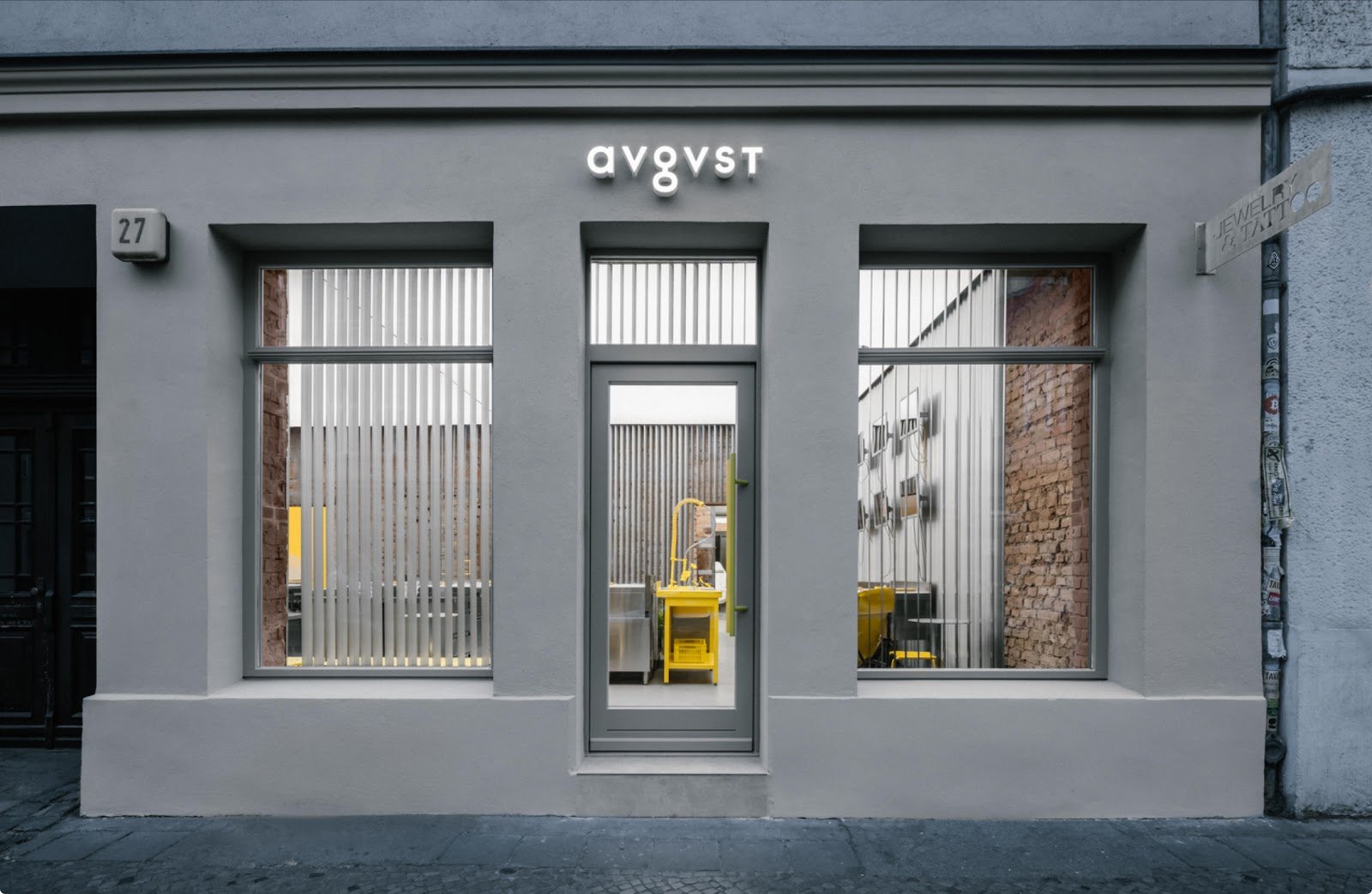 Так выглядит бутик в Берлине — бренд выбирает для своих магазинов лаконичные цвета (желтый, серый, белый) и локации с высокой проходимостью. Источник: Avgvst Jewelry Berlin