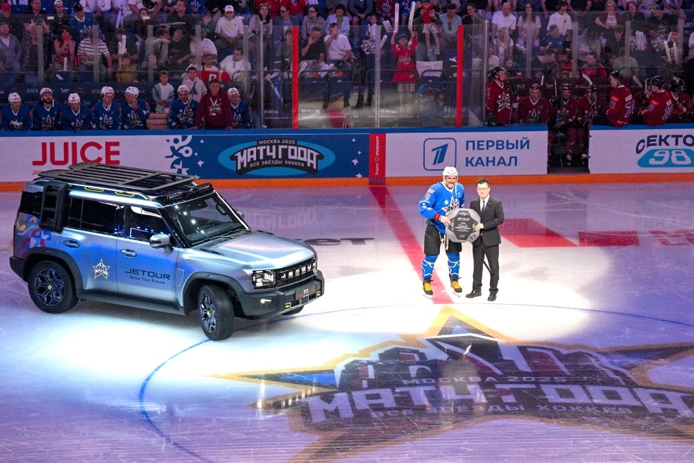 Овечкин после объявления участников вышел на лед последним, а затем на льду появился автомобиль, который ему подарили организаторы - Jetour T2.