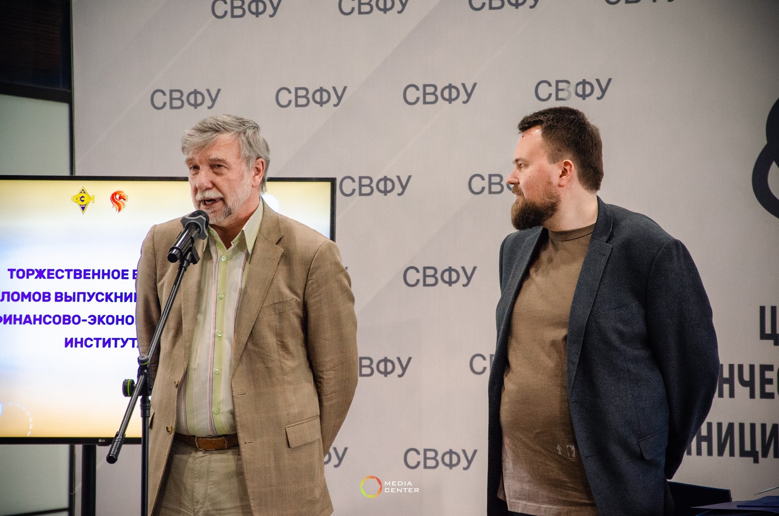 Поздравить выпускников приехали проректор НИУ ВШЭ Сергей Рощин и заместитель проректора Павел Травкин. Как отметил в своей речи Сергей Рощин, быть первыми — это всегда испытание. Не столько в части преодоления трудностей обучения, сколько в плане преодоления страха перед неизведанным. «Сегодня особенный день. Мы выпускаем студентов, которые прошли программу двух университетов — дружеских партнеров, которые объединили свои усилия для того, чтобы подготовить более умелых, опытных, квалифицированных молодых специалистов. Для Высшей школы экономики и Северо-Восточного федерального университета это важный этап. Эта программа реализуется благодаря большому количеству людей из двух университетов, все это выстроено для того, чтобы у нас получилось новое, качественное и востребованное образование. Я горжусь нашими выпускниками», — сказал Сергей Рощин.