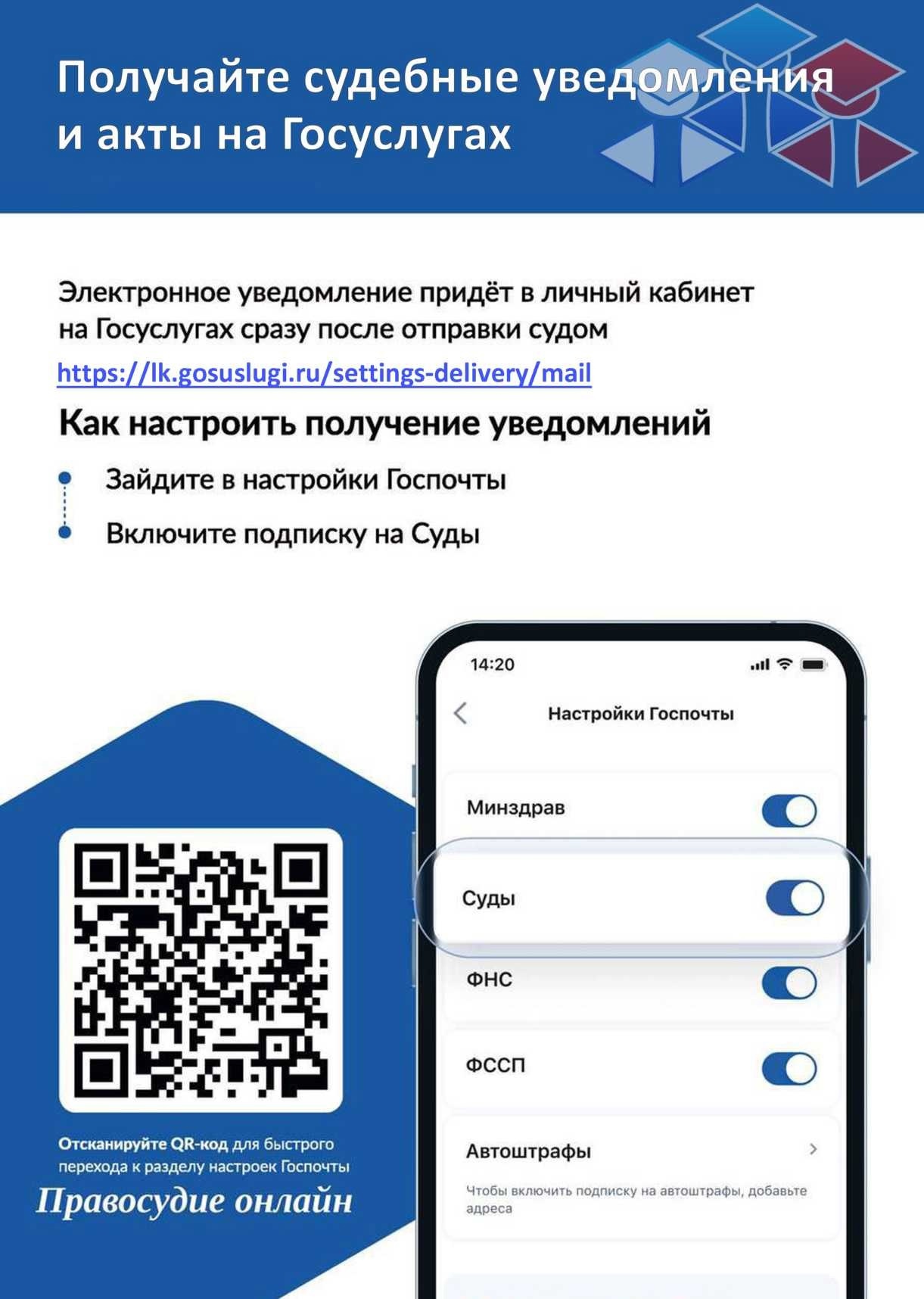 Для получения судебных уведомлений в электронном виде участники судебных разбирательств в настройках личного кабинета на портале Госуслуг проставляют соответствующую отметку.
