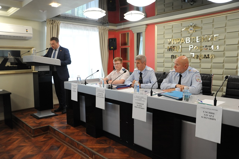 В заседании приняли участие глава г. Перми Эдуард Соснин, прокурор города Егор Шмырин, временно исполняющий обязанности начальника Управления МВД России по г. Перми Вадим Стрижков, а также руководители и личный состав подразделений городской полиции.