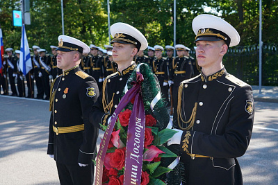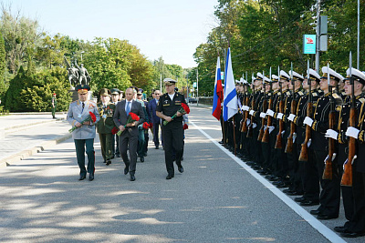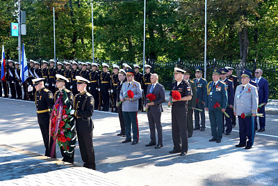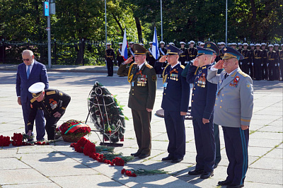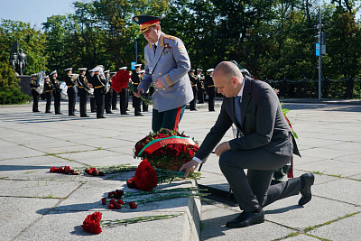Губернатор Алексей Беспрозванных, командующий Балтийским флотом ВМФ России Сергей Липилин вместе с делегацией возложили цветы к Вечному огню и почтили память героев Великой Отечественной войны минутой молчания.
