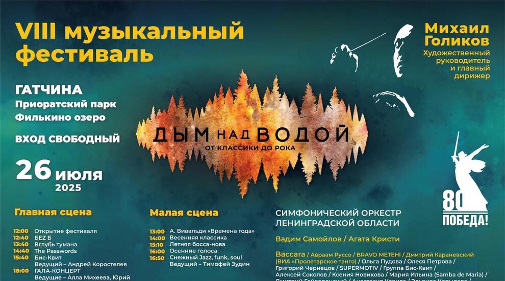Восьмой «Дым над водой» — особенный. Он обращается к теме преемственности и культурной памяти, переосмысляя связи между поколениями через музыку. В этом году страна отмечает 80-летие Победы, а Ленинградская область — 80 лет со дня основания областной Государственной филармонии. Кроме того, год объявлен Годом защитника Отечества. Фестиваль объединяет эти важные даты в одном символе — музыкальном диалоге, где встречаются история и современность.