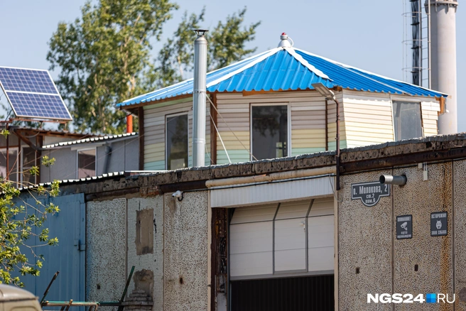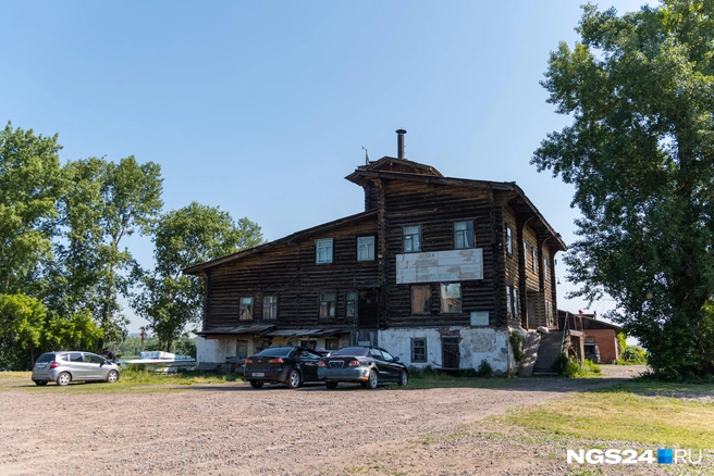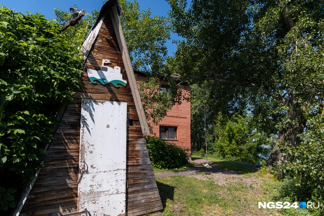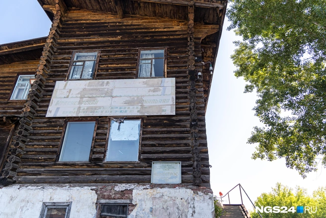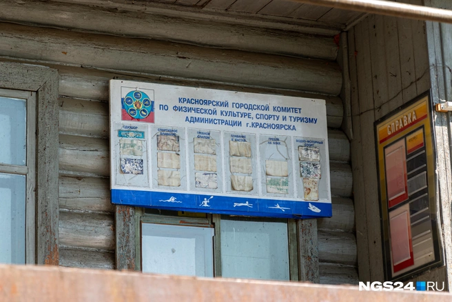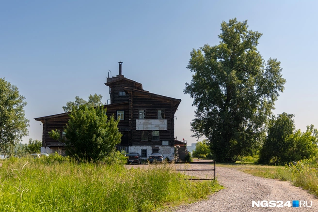 На фасаде бывшего гидроаэропорта еще висят выцветшие вывески «Альбатроса» и красноярской федерации водно-моторного спорта со стертыми буквами. Основание дома с белой штукатуркой — каменное, но большая часть здания деревянная. Наверху высится наблюдательная площадка.