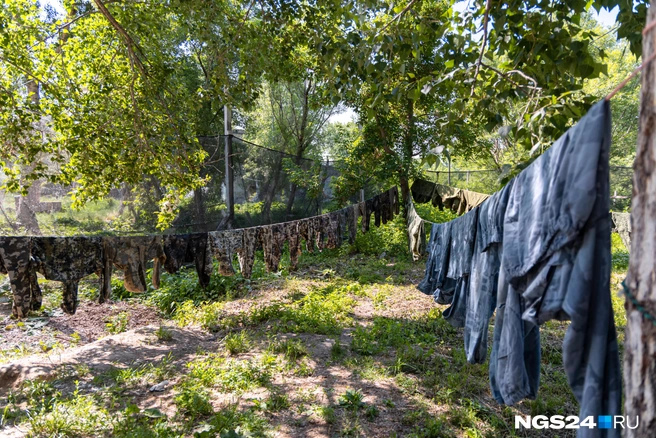 На веревках сушится камуфляжная одежда, поле сражения ограждает сетка, на самом поле сооружены укрепления, а за ним стоит техника для полевой кухни. Главное, пожалуй, украшение — вросший в землю и проржавевший ретро-автомобиль по центру территории.