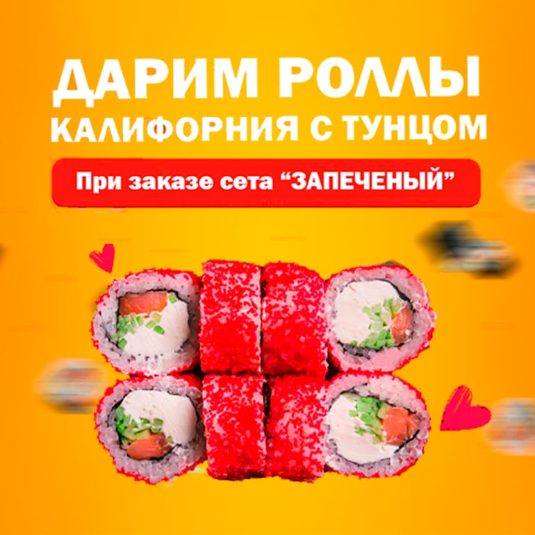 А при доставке сета "Запечённый" — получи "Калифорнию с тунцом" в подарок.