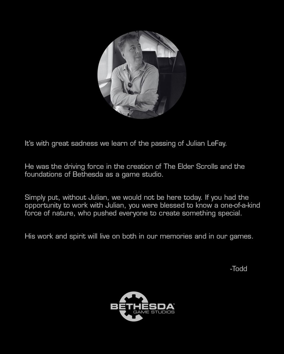 «С большой печалью мы узнали о кончине Джулиана ЛеФэя. Он был движущей силой в создании The Elder Scrolls и основоположником Bethesda как игровой студии.