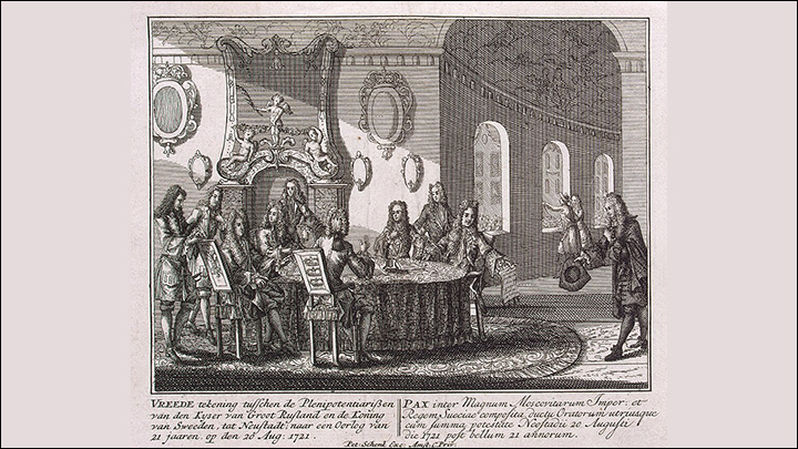 Подписание мирного договора в Ништадте 30 августа 1721 года, по которому Россия купила у шведов Прибалтику. Гравюра Питера Шенка — младшего. Источник: Commons.wikimedia.com