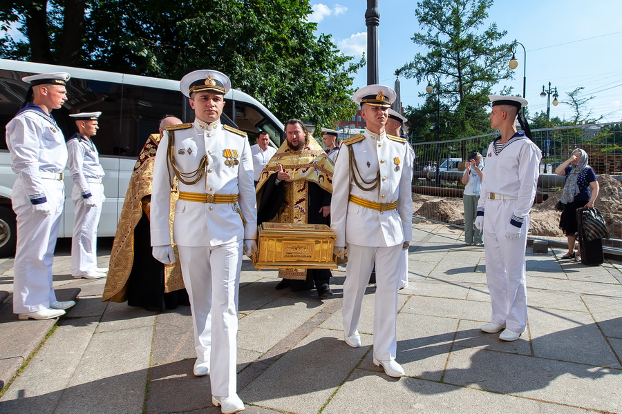 Святыни доставлены к празднованию дня ВМФ, который в этом году отмечается 27 июля, из Богоявленского Елоховского кафедрального собора Москвы по благословению Святейшего Патриарха Кирилла при содействии Фонда апостола Андрея Первозванного.