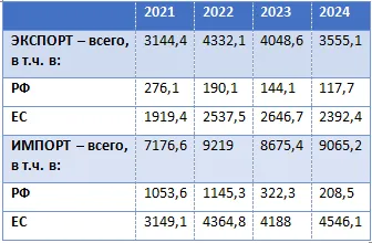 Таблица 1. Динамика экспорта и импорта Молдовы за 2021-2024 годы (млн. долларов США).