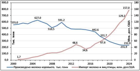 Диаграмма 1. Производство и импорт молока и яиц птицы за 2000-2024 гг.