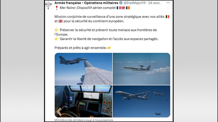 24 июля ВВС Франции и ВС Бельгии в своих официальных каналах в социальных сетях опубликовали кадры работы авиации НАТО в Чёрном море, о чём ранее предупреждали и мониторинговые ресурсы.