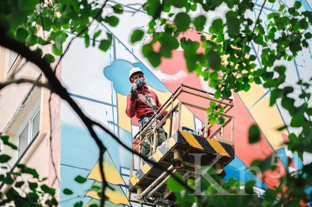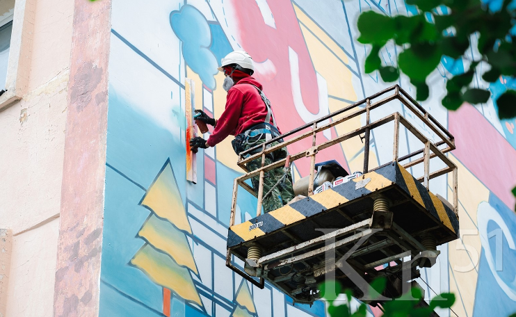 — В данных изображениях сложна симметрия, графика. На листе бумаги это сделать проще, чем на фасаде дома, — поделился Василий Цветков. – Кроме того, на многих элементах есть градиент, то есть растяжка цвета. На больших площадях это тоже представляет сложность. Цвета яркие — желтый, красный, синий, они имеют большой расход. К тому же ветер добавляет проблем: сдувает краску, пока она еще не успела долететь до стены.