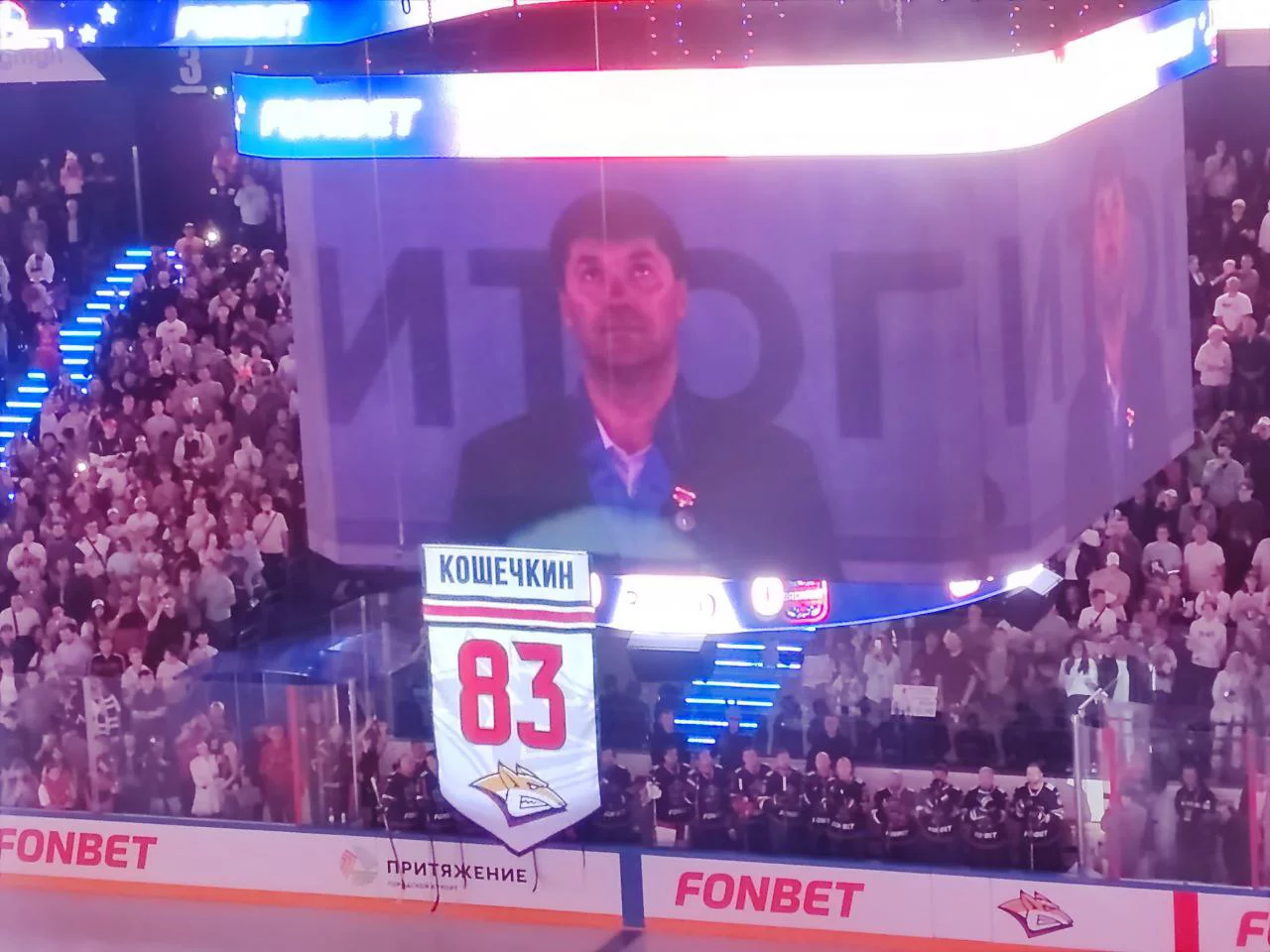 В клубном музее появилась экспозиция Василия Кошечкина: здесь мини-версия большого вратаря (вообще его рост два метра) и шлемы, в которых он выигрывал Кубок Гагарина, Кубок мира и, конечно же, олимпийское золото. И вот он, один из главных моментов вечера, — поднятие стяга с номером "83". Трибуны не умолкая кричат: "Вася!".