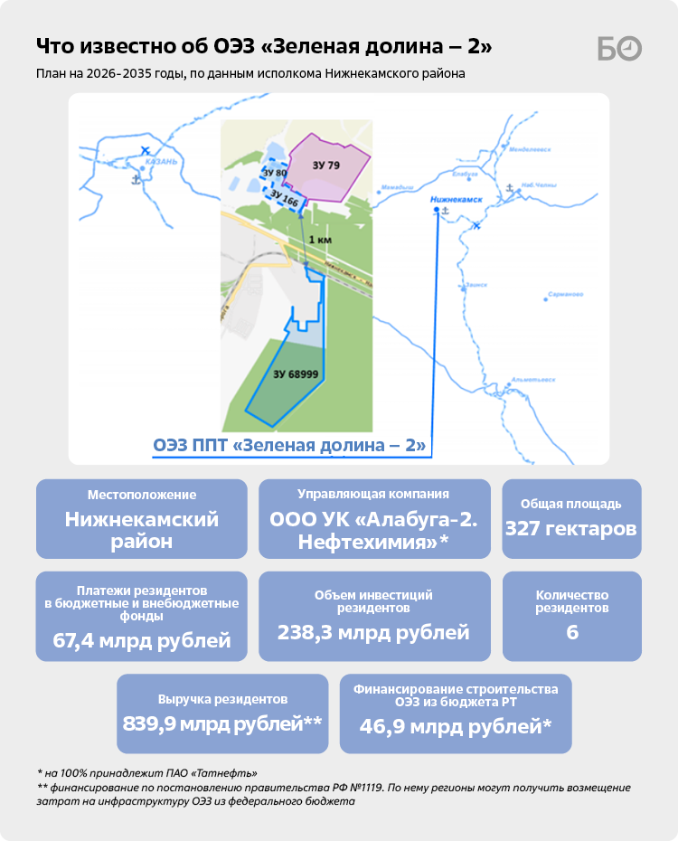 Инициативу по созданию новой ОЭЗ 17 июля уже одобрили депутаты Госсовета РТ. Любопытную информацию удалось почерпнуть из презентации главы района Радмира Беляева. Общая площадь «второй» «Зеленой долины» составит 327 га (почти в 20 раз больше первой очереди), 6 резидентов вложат в проекты 238,3 млрд рублей (59,8 млрд рублей — собственные средства) и создадут 1,8 тыс. рабочих мест. С 2026 по 2035 год они заплатят в бюджеты разных уровней 67,4 млрд рублей. При этом бюджет республики раскошелится на 46,9 млрд рублей, чтобы построить инфраструктуру для ОЭЗ. Финансирование будет вестись по постановлению правительства РФ №1119. По нему регионы могут получить возмещение затрат на инфраструктуру ОЭЗ из федерального бюджета. Управляющей компанией выступит ООО УК «Алабуга-2. Нефтехимия» (на 100% принадлежит «Татнефти»).