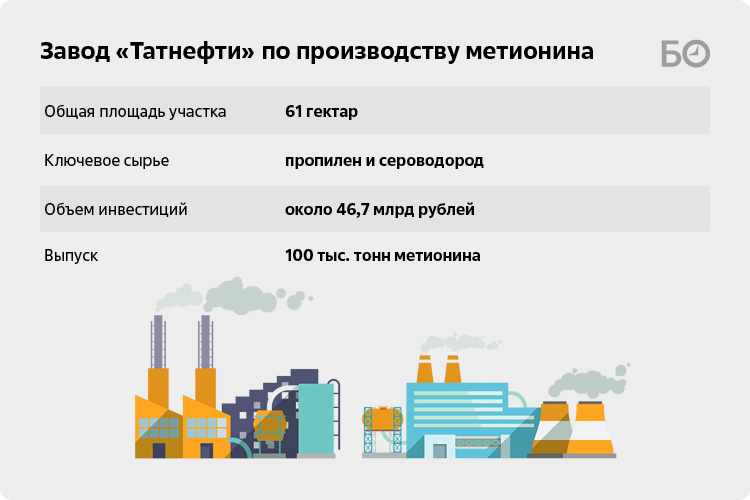 Второй проект «Татнефти» в ОЭЗ «Зеленая долина – 2» предполагает выпуск 100 тыс. т метионина — это другая незаменимая аминокислота. «Производство метионина в мире — закрытый клуб. Благодаря этому рентабельность продукта достаточно высокая. Производить метионин в России, на мой взгляд, очень коммерчески выгодно. Кроме того, это вклад в пищевую и кормовую безопасность страны!» — говорит один из собеседников издания.