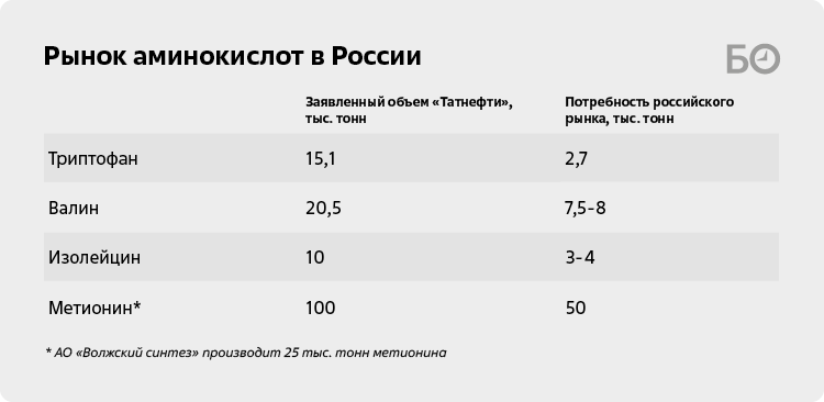 «Заявленные [«Татнефтью“] аминокислоты на данный момент не производят в России, их на 100 процентов импортируют, поэтому проект очень важен с точки зрения замещения импорта критически важных кормовых ингредиентов. Насколько известно, потребление изолейцина в России составляет 3–4 тысячи тонн в год, валина — 7,5–8 тысяч тонн в год», — указал Радин. По данным на 2022-й, потребность российского рынка в триптофане оценивалась в 2,7 тыс. тонн.