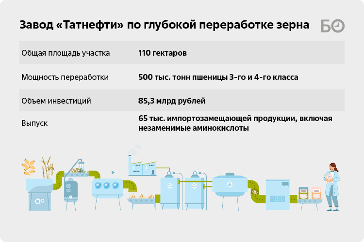 Почти половину от запланированных инвестиций — 132 млрд рублей — осуществит сама «Татнефть». Комплекс глубокой переработки зерна (ГПЗ) и производство метионина займут 171 га в лесном массиве Бикляньского лесничества. Будущий кластер расположится рядом с другим активом компании — АО «Нижнекамсктехуглерод».