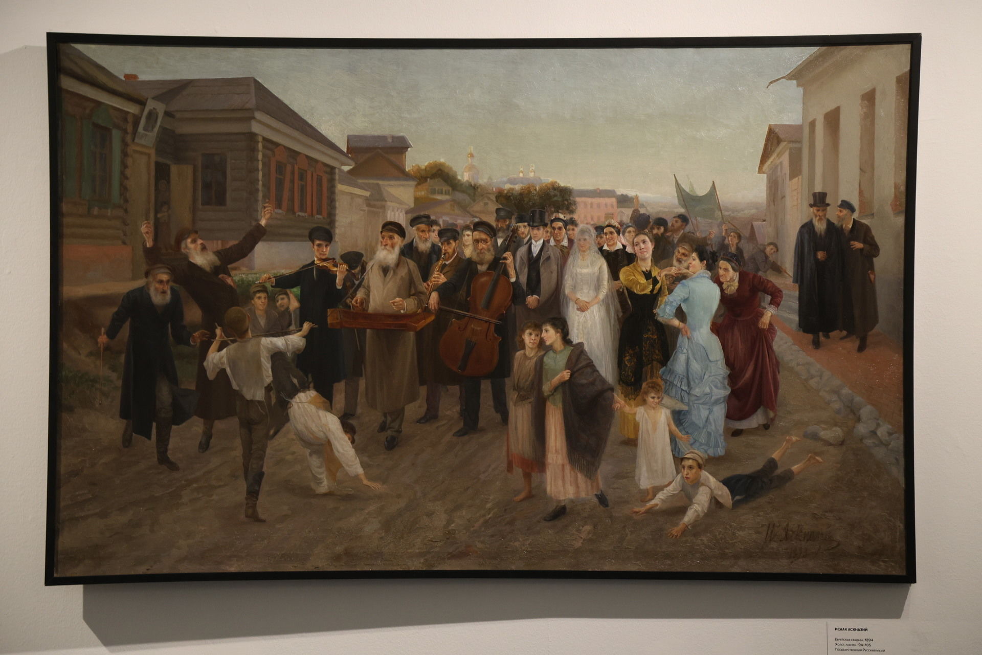 Первая работа, которая встречает посетителя, – «Еврейская свадьба» Исаака Аскназия. Он стал первым евреем, получившим звание академика живописи. Это самое высокое признание для художника в дореволюционной России. Его картина хранится сейчас в Русском музее, который предоставил ее галерее на время выставки.