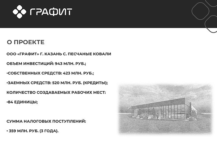 Привлек Лаишевский район и компанию «Графит» из Тюмени, которая занимается производством утеплителей. Проект реализуется в селе Песчаные Ковали. Общий объем инвестиций — 943 млн рублей. Создано 84 новых рабочих места. Предприятие будет производить экструдированный пенополистирол — теплоизоляционный материал. Ежегодная выручка составит 6 млрд рублей, расписывал владелец завода Ринат Гаисин.В случае запуска «Графит» станет третьим крупнейшим производителем этого утеплителя в стране. Но есть одно но.