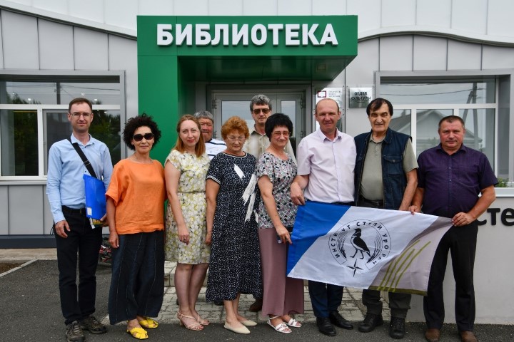 Участники экспедиции с главой администрации муниципального образования Беляевский район Ю. В. Михалевым в библиотеке с. Беляевка