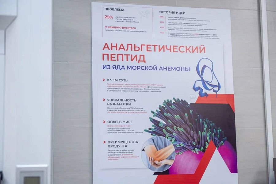 Лаборатория хроматографического разделения белков, где разработан инновационный лекарственный препарат широкого спектра – анальгетический пептид из яда морской анемоны. Это безопасная и эффективная альтернатива опиоидным анальгетикам. Работы ведутся совместно ТИБОХ ДВО РАН при поддержке ГК «Арника». В рамках программы «Приоритет-2030» начаты доклинические испытания средства и разработка технологии промышленного производства.