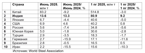 По данным World Steel Association (WSA), в июне 2025 г. объем производства стали в 70 странах, которые подают свои статистические данные, составил 151.4 млн т (-5.8% к июню 2024 г.). За первое полугодие 2025 г. произведено 934.3 млн т (-2.2% к 1 пг 2024 г.).