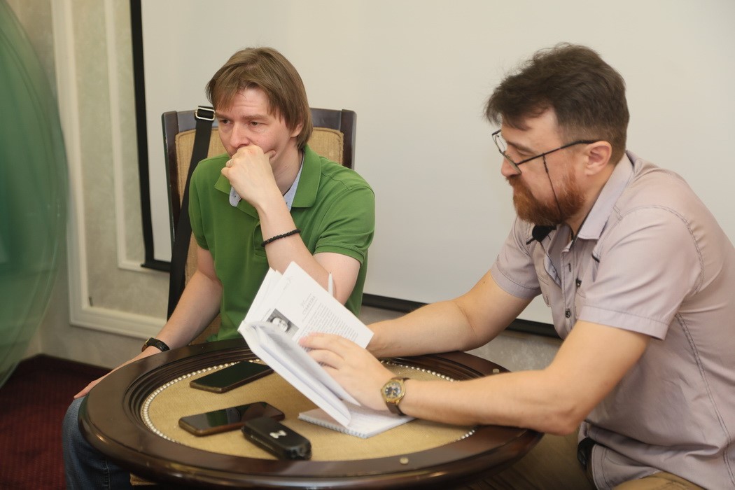 Поэт и публицист Михаил Кильдяшов вместе с гостем – поэтом, прозаиком, участником СВО Алексеем Шороховым разбирали рукописи присутствующих, говорили о развитии творческого потенциала в мире поэзии, опираясь на положительные примеры.