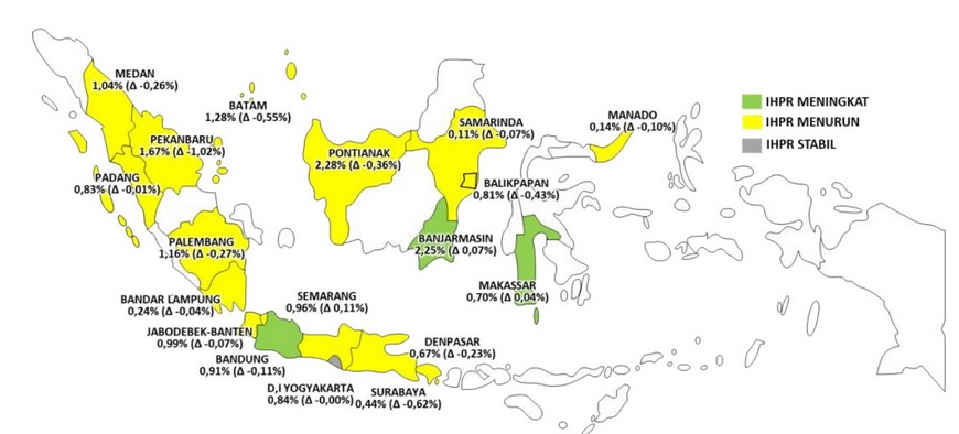 В главном городе острова Бали, Денпасаре, годовой рост цен составил 0,67%. Это меньше, чем в предыдущем квартале (+0,90%).