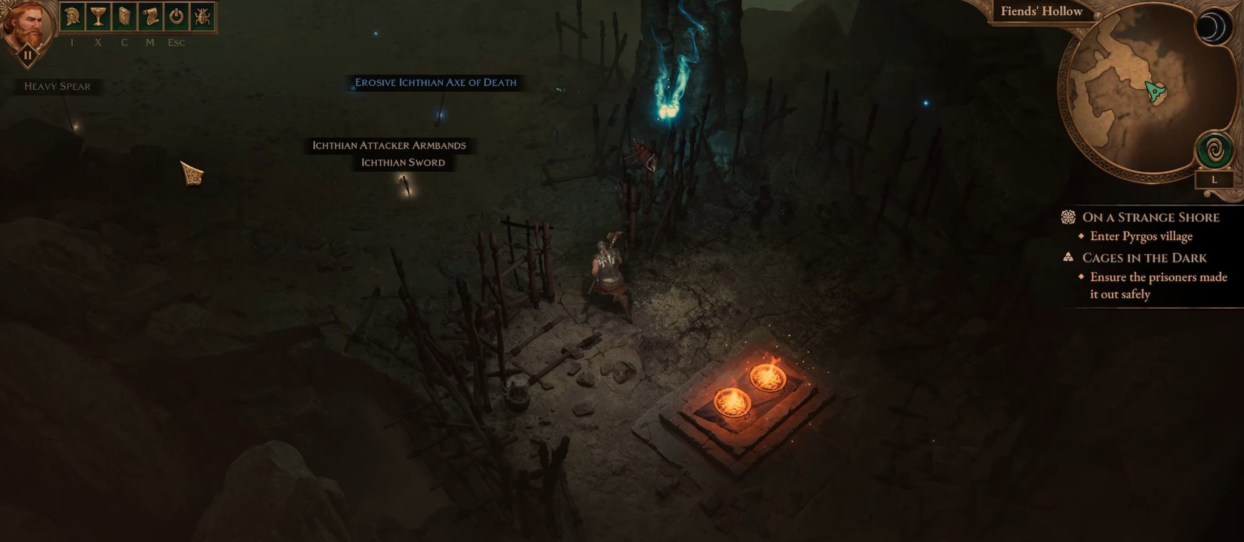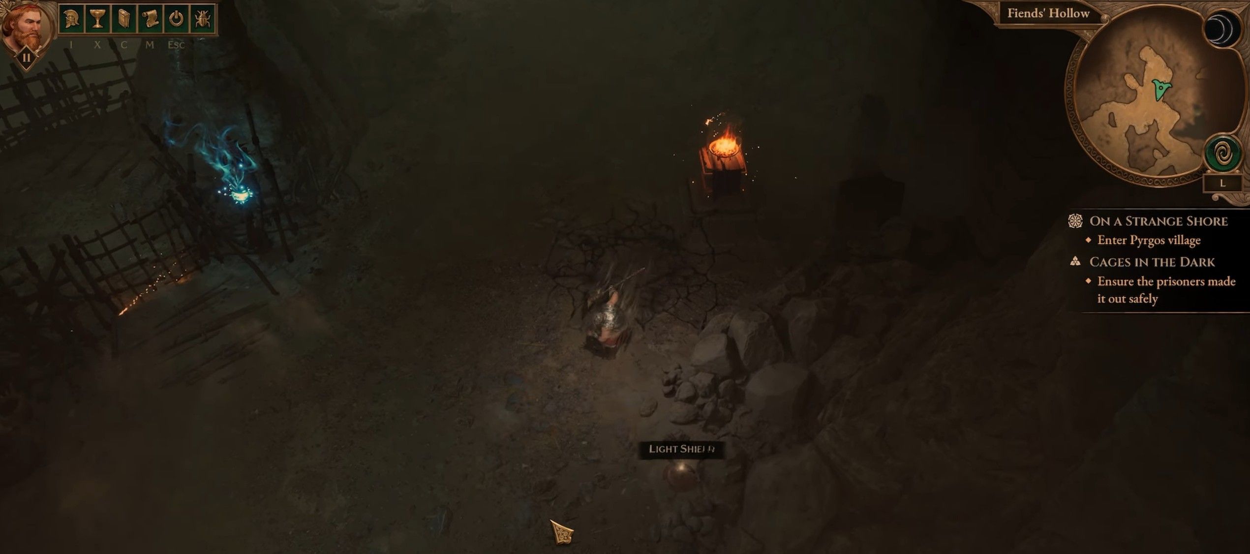Сперва отправляйтесь в северное ответвление локации. В самом его конце у пустой железной клетки вас ожидает одиночно стоящая жаровня, разожгите в ней пламя щелчком мыши. Далее выдвигайтесь в восточный тоннель, идите по нему, пока не достигнете деревянного забора с открытым проходом. Вы здесь уже были ранее и освободили нескольких заключенных по квесту. За ним вы обнаружите пару чаш, которые также необходимо зажечь (сделать это можно в любом порядке). Теперь остается лишь вернуться к строенной жаровне на северо-западе, воспламенить все ее секции и наблюдать, как откроется таинственная дверь.