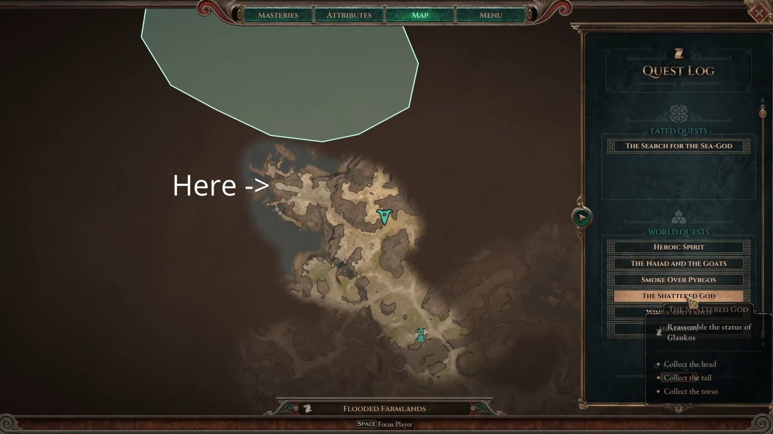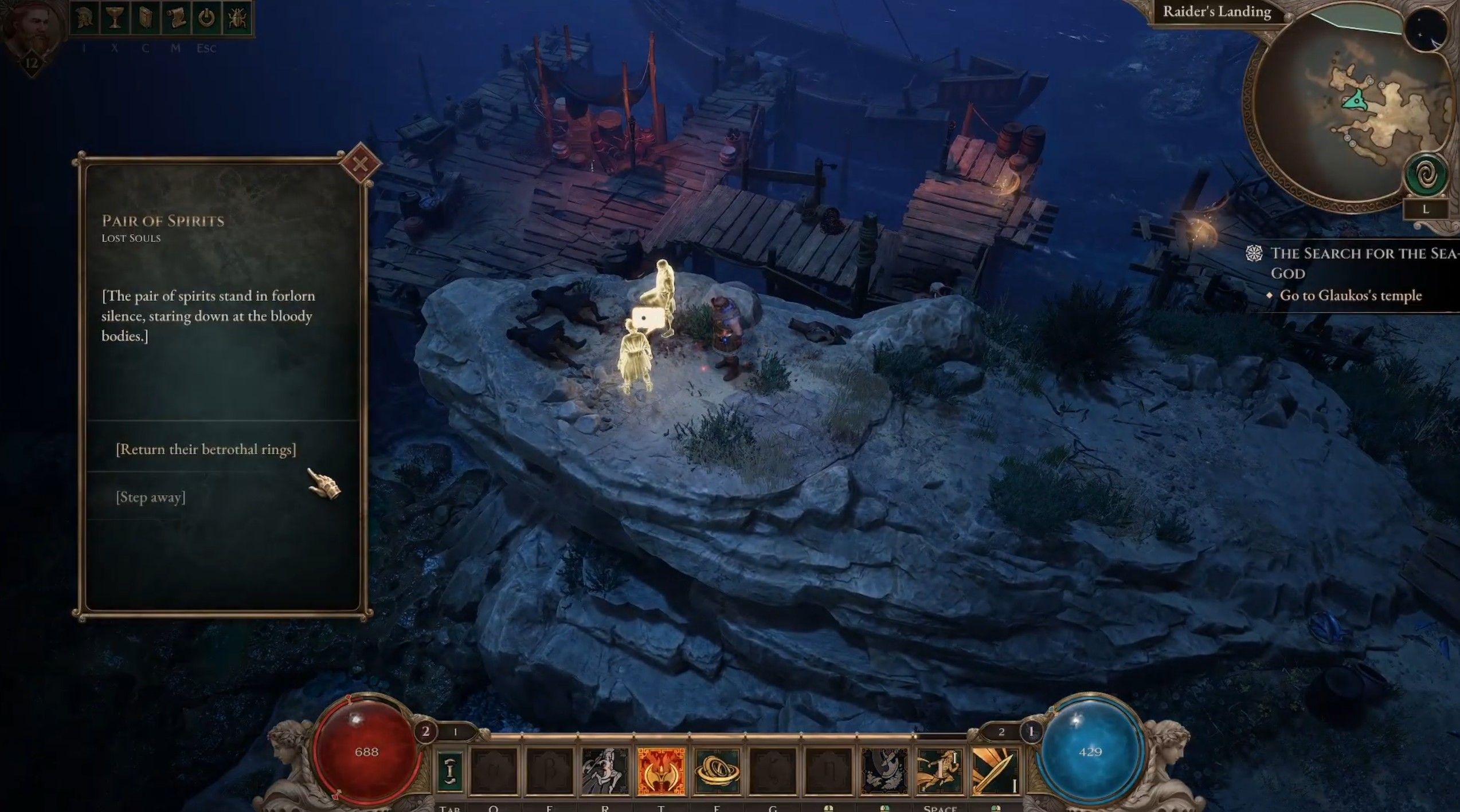 В локации можно разглядеть как минимум три причала, но вам нужны не они, а возвышающаяся над ними скала в центральной части побережья. На утесе вы обнаружите двух призраков. Поговорите с Филией — привидением, которое находится южнее. Далее в диалоге выберите вариант «Вернуть обручальные кольца», пара примет их и перейдет в иной мир, наконец обретя покой. За завершение этого мини-квеста вы удостоитесь награды в 5 609 очков опыта и 10 Углей Ночи.