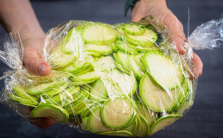 Завяжите рукав с обеих сторон, встряхните несколько раз, чтобы все ингредиенты перемешались. Оставьте кабачки в холодильнике на 15–20 минут для маринования.
