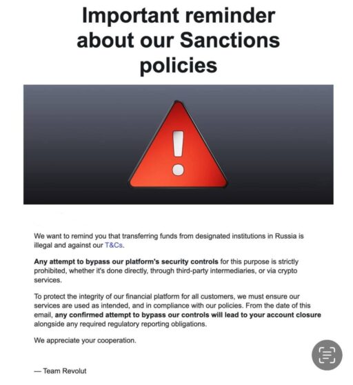 Telegram-канал Forbes Russia пишет, что ограничение касается любых источников внутри России, а не только компаний и лиц под санкциями. Более того, поскольку прямое пополнение счета из России фактически невозможно, запрет распространяется на поступления через третьи страны — когда деньги переводятся из России сначала в Казахстан, Кыргызстан, Армению, а затем поступают на счет в Revolut, объяснила Смирнова.