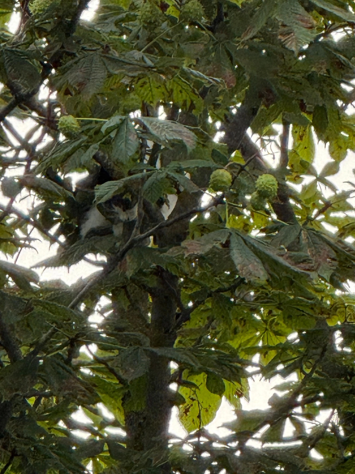 Как рассказал автор, у одного из домов города кошка просидела на дереве четыре дня. Животное забралось на уровень пятого этажа и не смогло слезть. Жильцы дома не смогли снять кошку самостоятельно, так как ветки каштана, куда она забралась, спилены до третьего этажа.