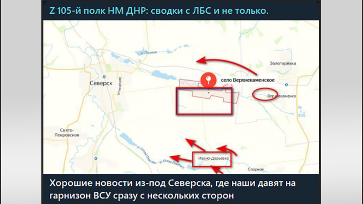 Наступление на Северск идёт двумя параллельными ударами, что дополнительно усложняет врагу манёвр силами. Скриншот: ТГ-канал "Z 105-й полк НМ ДНР"