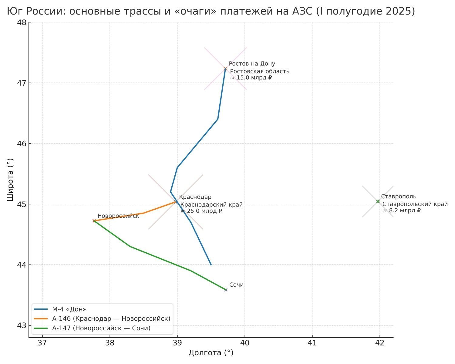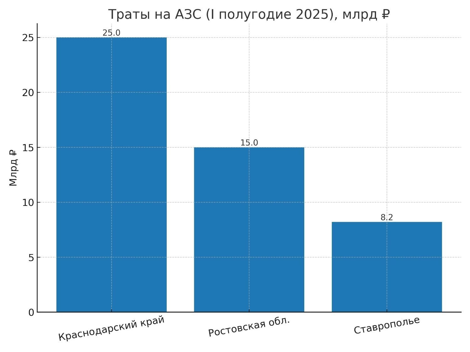 Суммарно три южных региона — Кубань, Ростовская область, Ставропольский край — обеспечили 84% всех трат южных территорий. Это не только эффект плотной автодорожной сети и транзитных коридоров (М-4 «Дон», А-146, А-147), но и следствие курортной специфики: летом автомобилисты массово едут на Черное море и Кавказ.