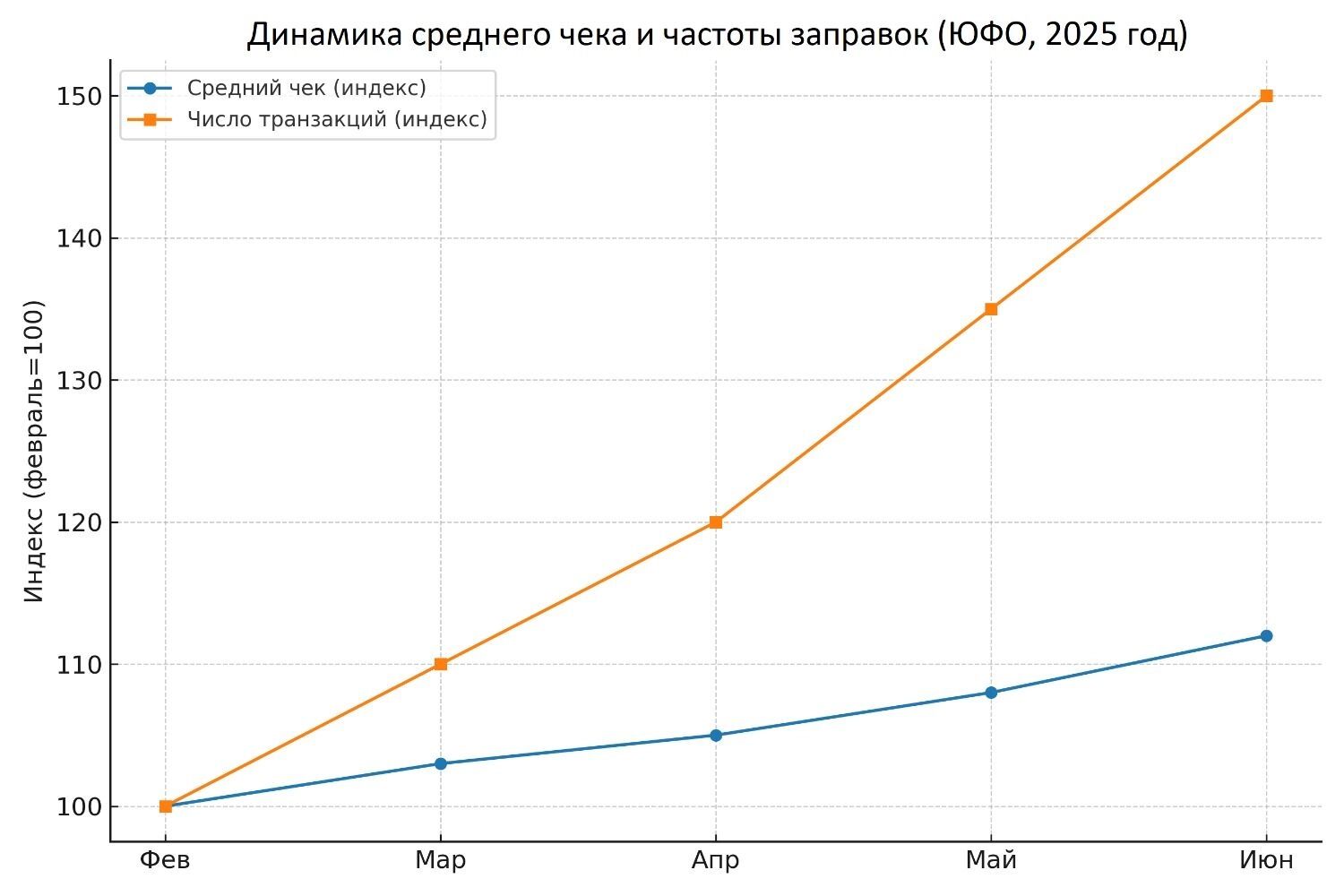 Повышение среднего чека и объема платежей на АЗС имеет несколько объяснений. Во-первых, влияние ценовых факторов: в 2024–2025 годах ряд индикаторов рынка топлива демонстрировал повышение, что отражается на среднем чеке.