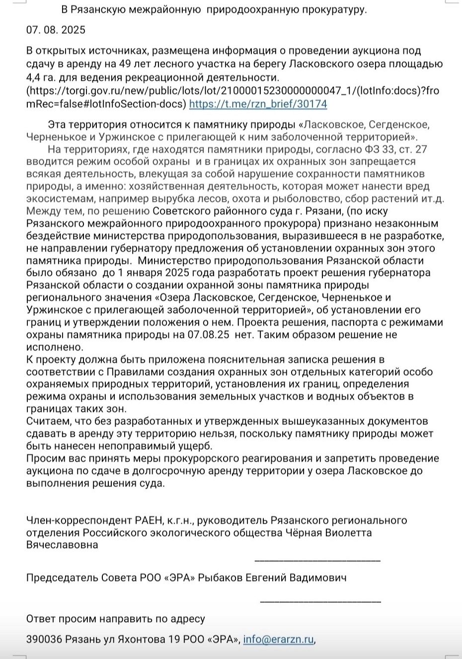 Письмо подписали академик РАЕН, кандидат географических наук, руководитель Рязанского регионального отделения Российского экологического общества Виолетта Черная и председатель Совета РОО «ЭРА» Евгений Рыбаков.