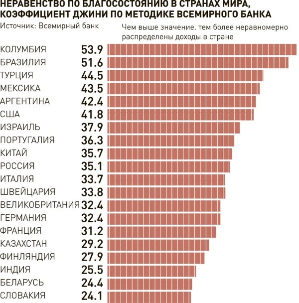 Росстат замеряет коэффициент Джини, по которому определяют степень неравномерности распределения доходов населения. По итогам 2024 года этот коэффициент немного вырос - до 0,408 после 0,405 в 2023 году. Показатель почти откатился к значениям за 2021 год - тогда он составлял 0,409. Россия по коэффициенту Джини относится к группе стран со средним уровнем неравенства и располагается рядом с Италией, Ираном и Таиландом.
