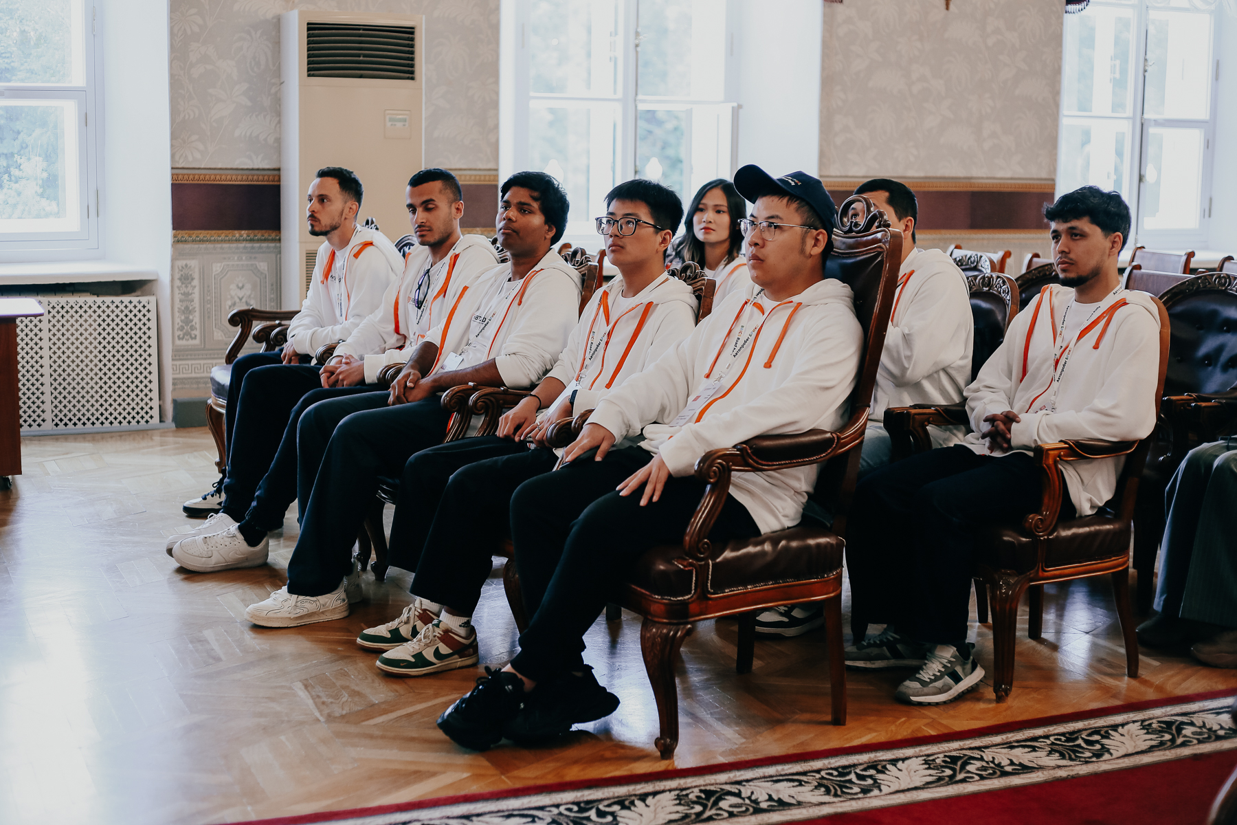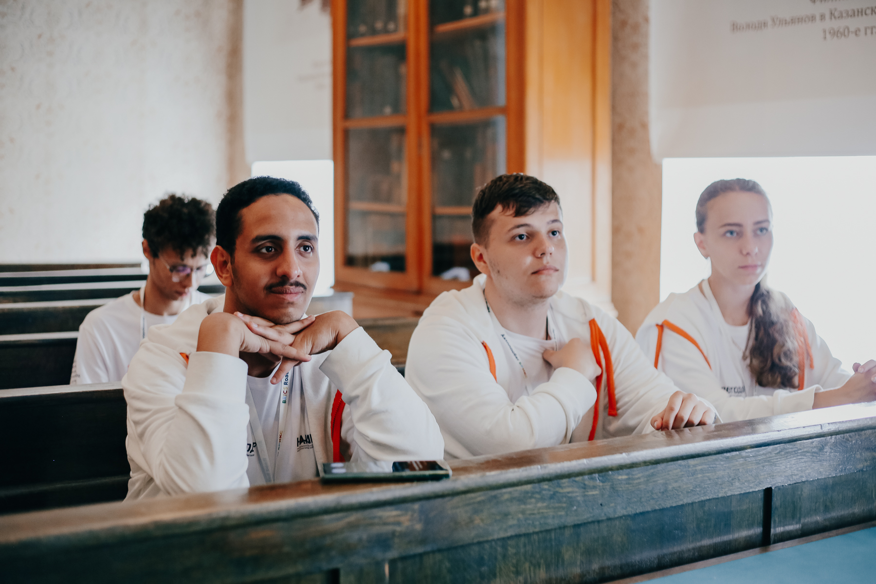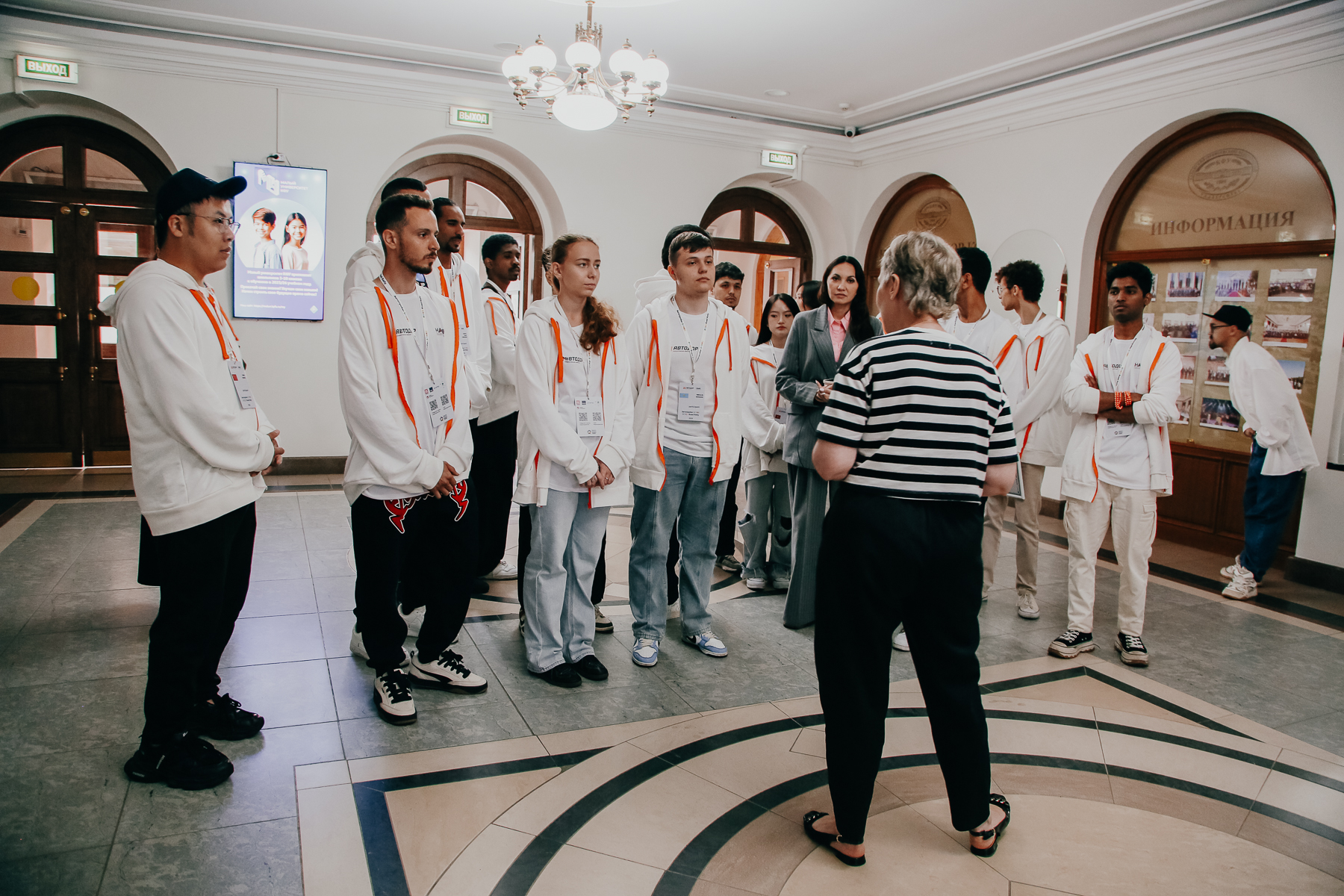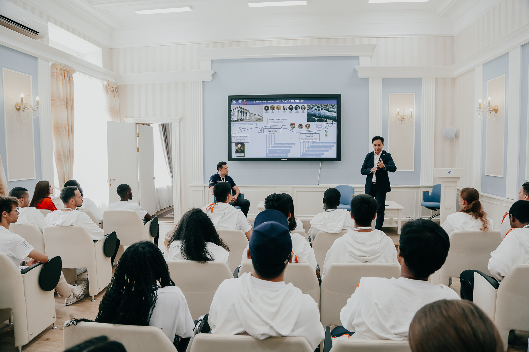 В Казанском университете для гостей была организована обширная программа. Визит начался с посещения главного здания вуза. Здесь для них провели экскурсию в знаковые места – Императорский зал, знаменитую Ленинскую аудиторию – мемориальную аудиторию № 7 юридического факультета, Музей истории Казанского университета. Затем со студентами встретился проректор по внешним связям КФУ Тимирхан Алишев.