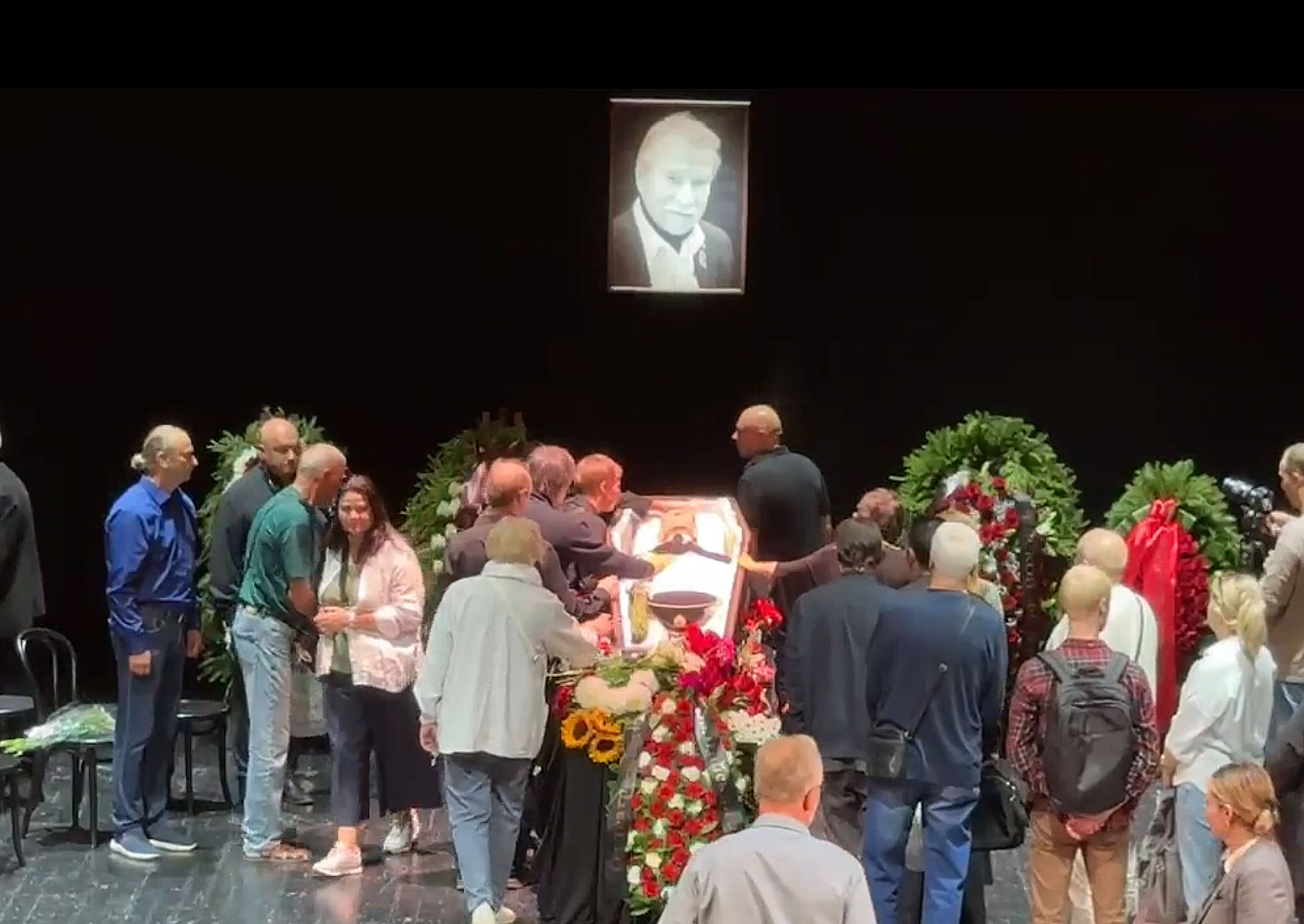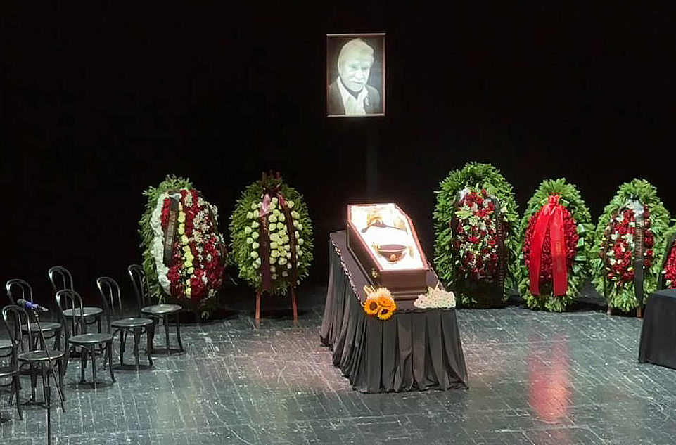 Телеграммы также прислали Большой драматический театр имени Г. А Товстоногова, петербургский Театр музыкальной комедии, Театр Комедии имени Н. П Акимова, Театр-фестиваль «Балтийским дом», Молодежный театр на Фонтанке, Законодательное собрание города и ряд других учреждений. Рядом с гробом, установленным в центральной части сцены, – венки, в том числе от Андрея Малахова, киностудии «Ленфильм», Союза театральных деятелей России.