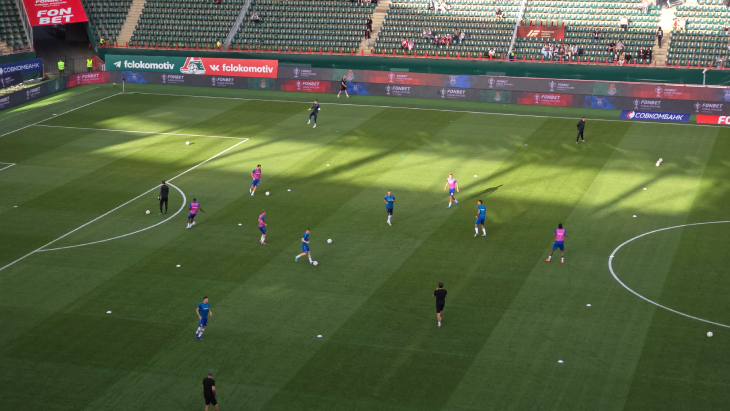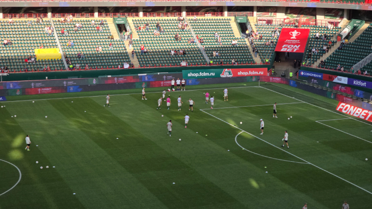 17:50 Локомотив первый на разминке — а стадион пока что начинает заполняться.