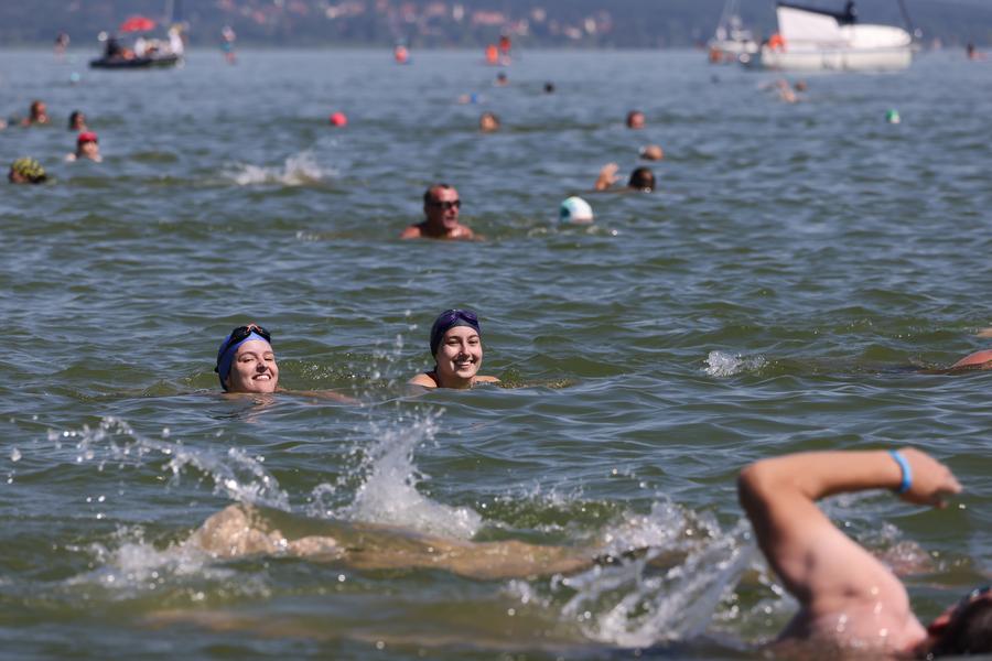 9 августа, Венгрия. Люди участвуют в соревнованиях по переплыву озера Балатон. /Фото: Синьхуа/