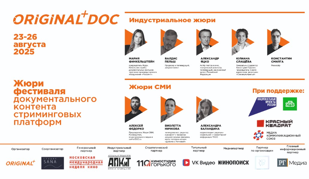 III фестиваль документального контента стриминговых программ платформ ORIGINAL+Doc пройдет с 23 по 26 августа в партнерстве с Московской международной неделей кино в кинотеатре «Москино Музеон».