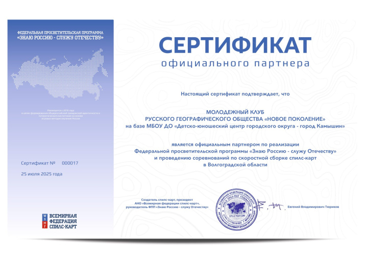 Молодежный клуб Русского географического общества «Новое поколение» стал официальным партнером всемирной федерации спилс-карт по реализации Федеральной просветительской программы «Знаю Россию — служу Отечеству». Соответствующий сертификат был подписан 25 июля 2025 года. Данную программу молодежный центр РГО в Камышине реализует с 2019 года.
