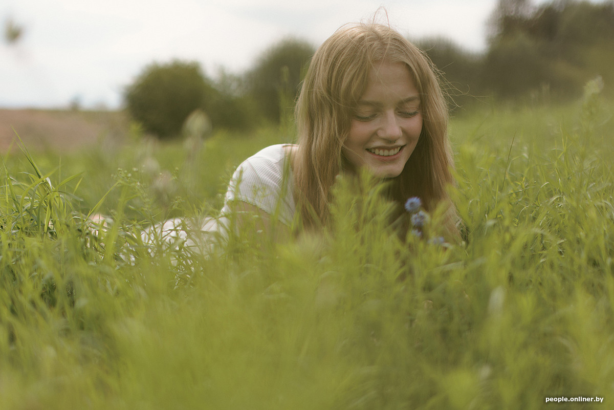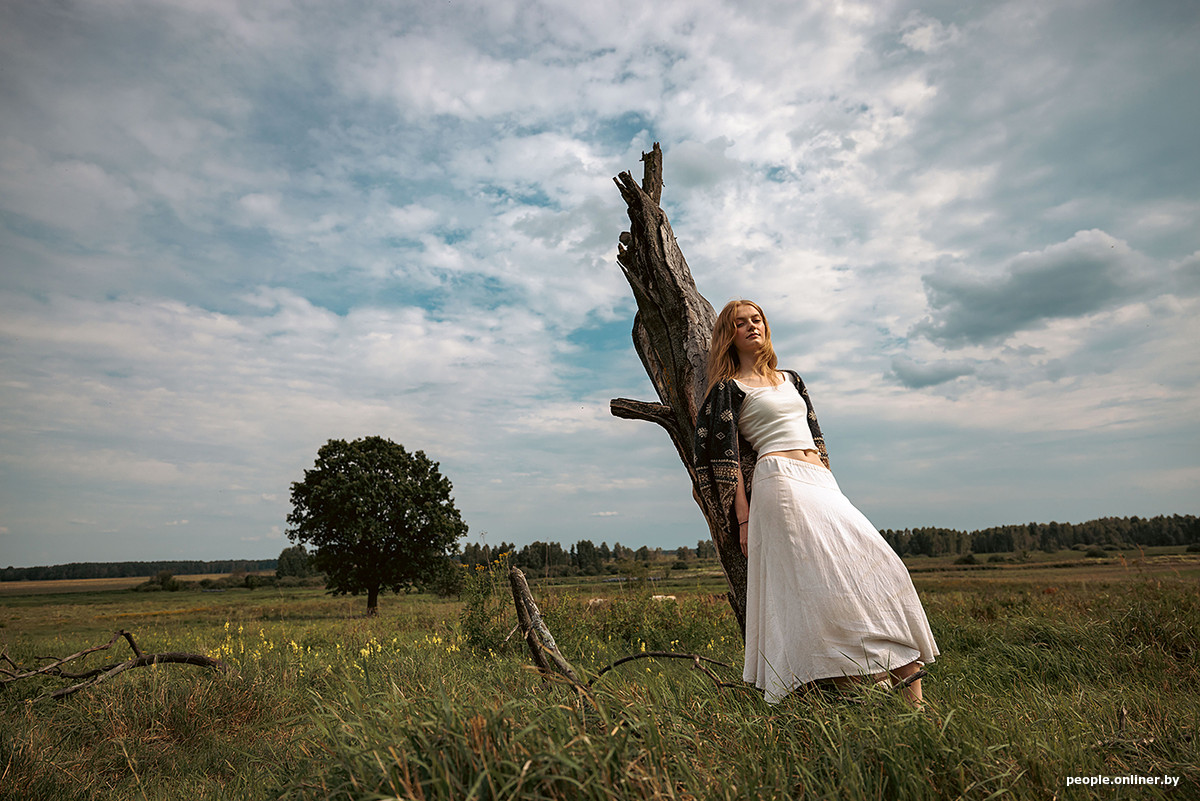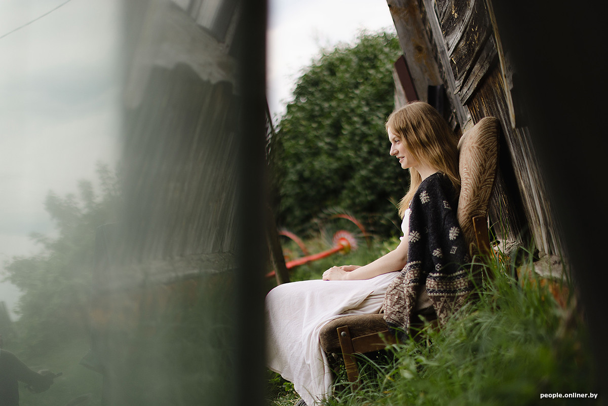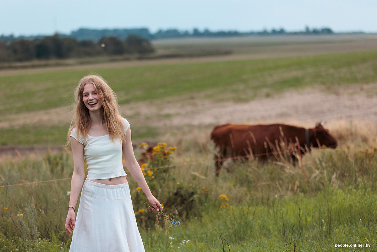 Деревенские мужики активно наблюдают за процессом: любуются. Кстати, наверняка это первая и единственная фотосессия Алеси в резиновых сланцах, а не на каблуках. И в этом что-то есть, согласитесь.