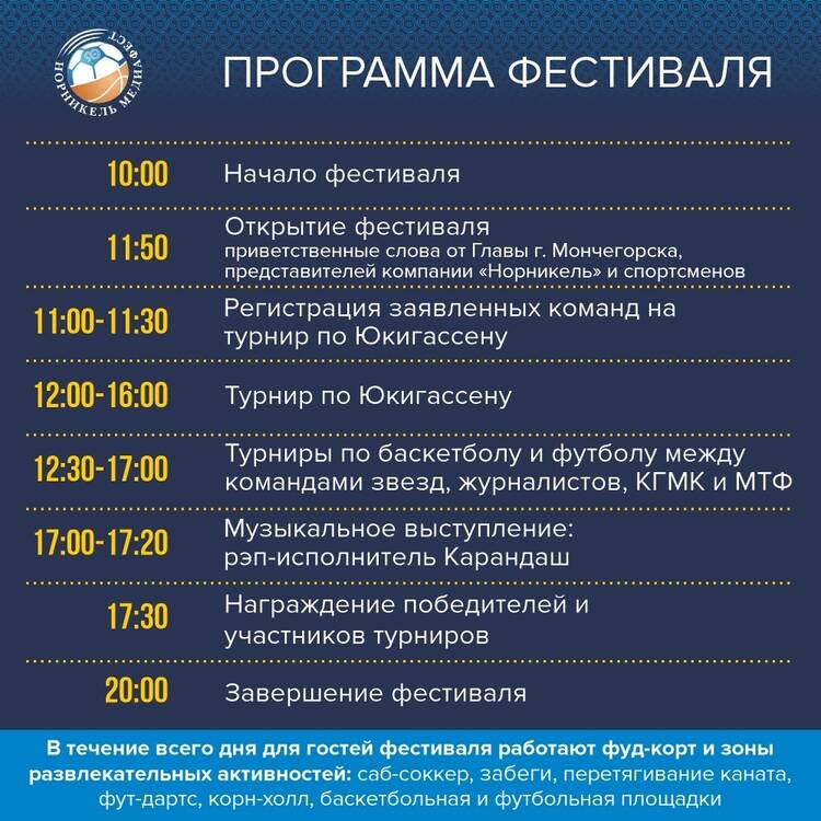 16 августа в Мончегорске пройдет первый в истории «Норникель медиафест» (12+). Гостей ждет насыщенная футбольная и басктебольная программа: мастер-классы, турниры и другие спортивные активности.